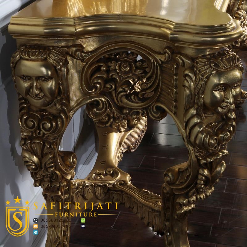 Meja konsul Desain Italia Mewah berbahan kayu dasar jenis mahoni grade A kelas kualitas export dengan proses komponen melalui proses oven sehingga akan mendapatkan bahan baku yang kering dan padat. Selanjutkan akan di proses oleh tukang kayu dan ahli seni ukir asli pribumi jepara.