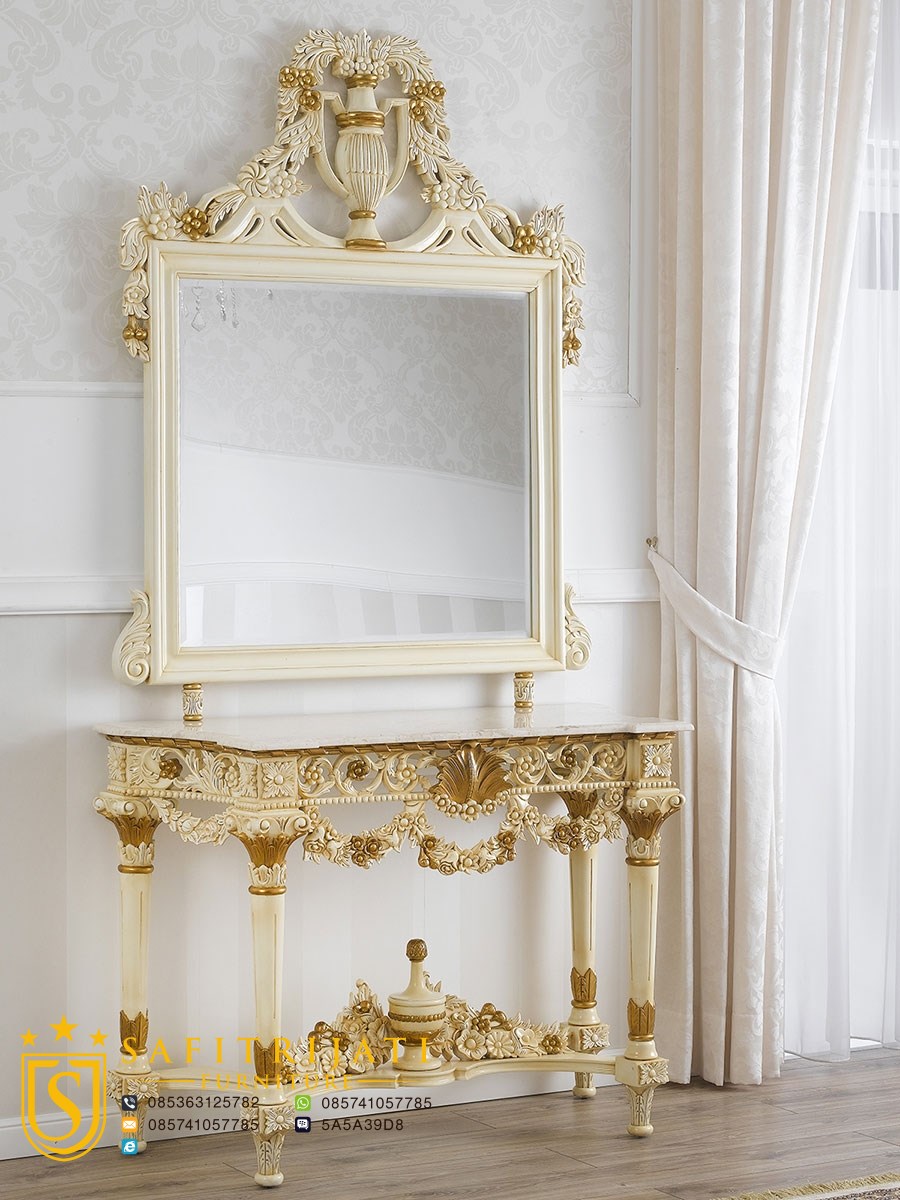 Meja Konsul Vintage Model Klasik kita aplikasikan dengan warna evory dan kombinasi tempel emas yang melekat sehingga menambah kesan mewah, elegan dan terbaru, apalagi corak emasnya kita aplikasikan dengan warna emas tempel sehingga ukiran menghasilkan lebih hidup dan lebih bagus. Set meja konsul mewah dengan cermin akan sangat bagus apabila di pasang di ruangan rumah anda sangat cocok buat anda yang gemar dengan model mebel jepara ukiran.