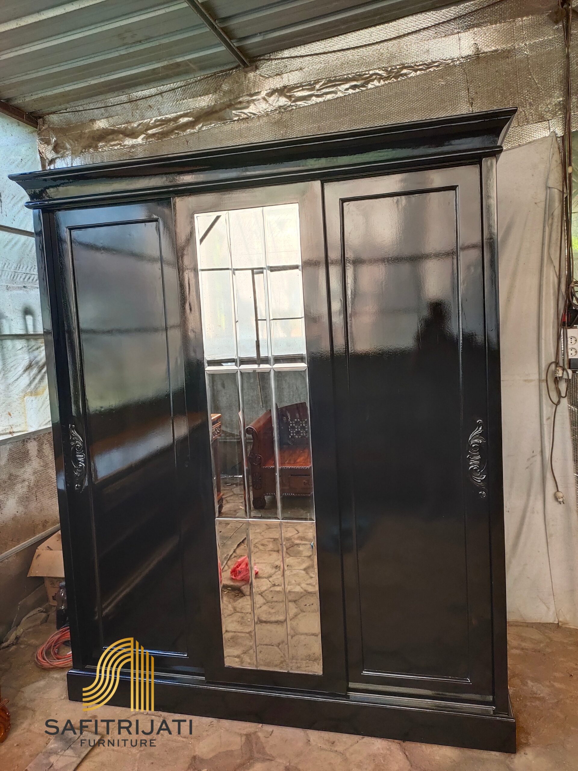 Lemari pakaian pintu 3 sleding manggunakan warna dark brown gloss, bahan finishing yang digunakan adalah impra dengan top coat NC yang aman untuk kesehatan dan tidak berbau menyengat. anda bisa juga meminta perubahan warna finishing lain sesuai dengan keinginan anda. CEK VIDEO MEBEL JEPARA TERBARU