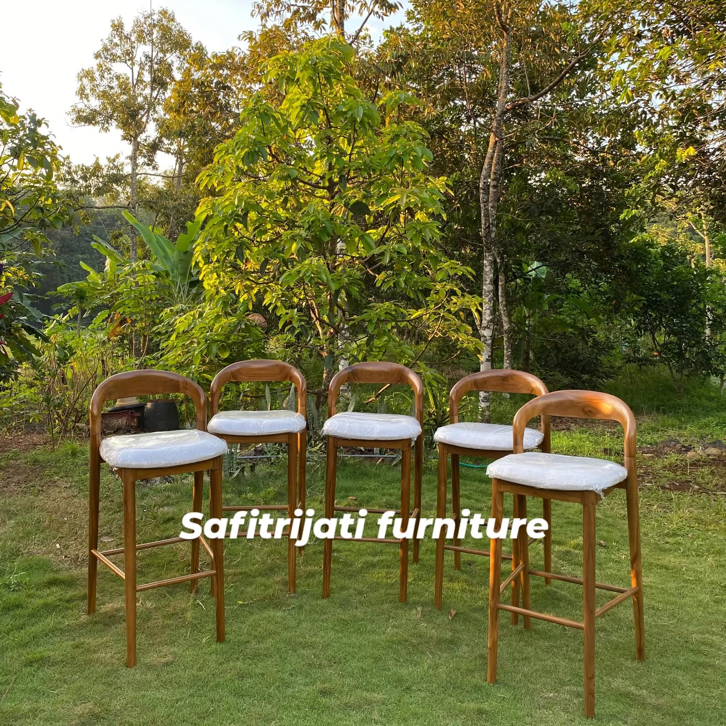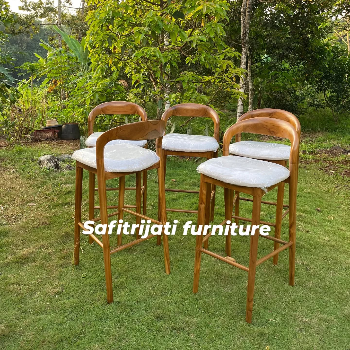 Pastikan kursi bar terbuat dari jati solid, bukan kayu campuran. Jati tua dari Perhutani biasanya lebih awet dan memiliki serat yang indah.