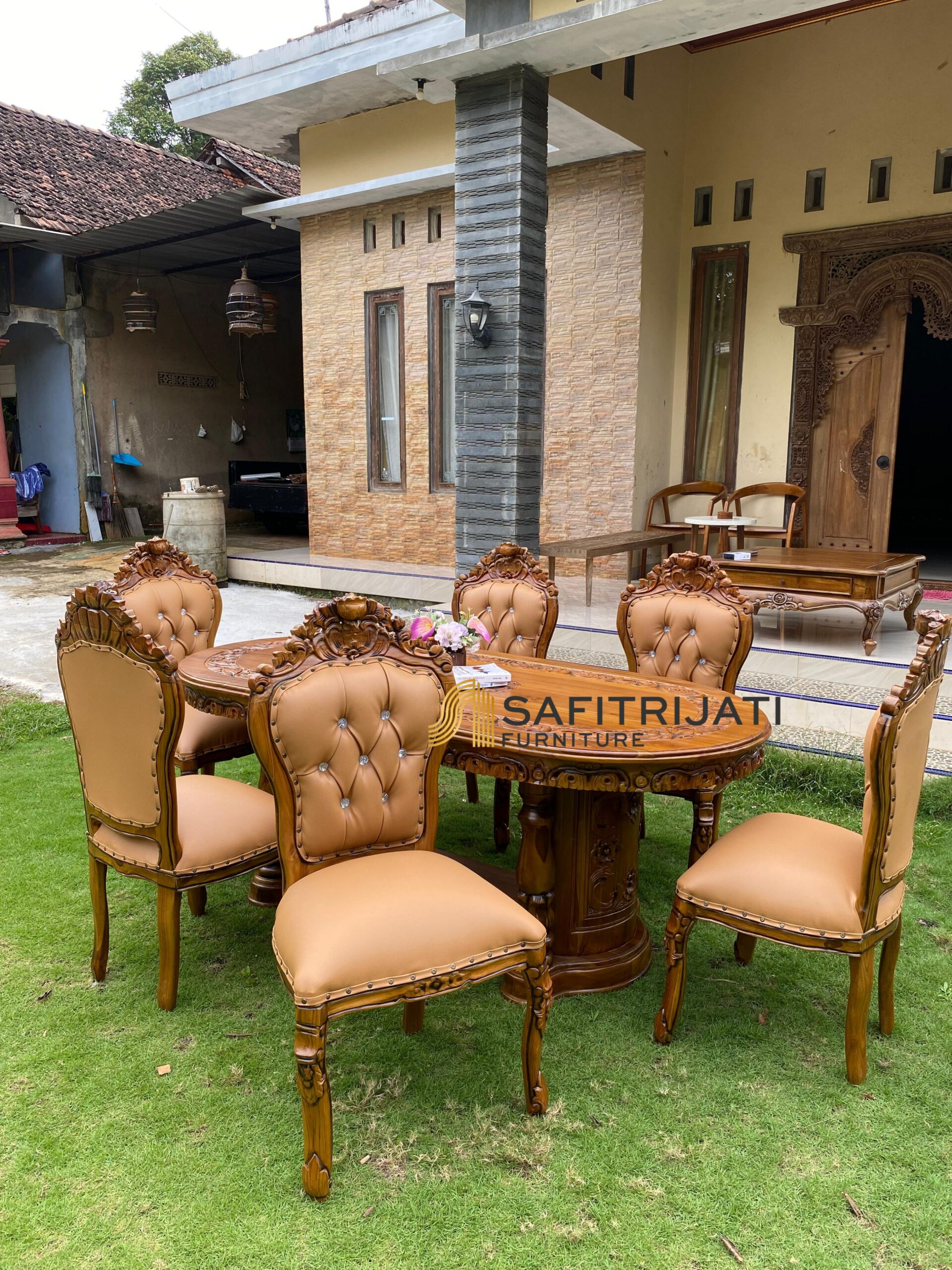 Finishing halus dengan detail ukiran sederhana menambah kesan mewah dan tahan lama, menjadikan kursi ini tidak hanya fungsional tetapi juga estetis. Sangat cocok dipadukan dengan berbagai model meja makan, baik klasik maupun modern.