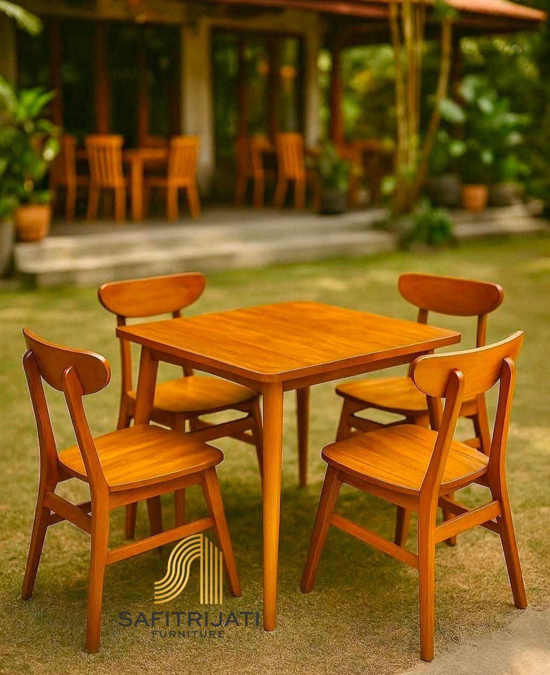 Biasanya terdiri dari 4 kursi, dan 1 meja utama dengan ukuran 80cm x 80cm. Paket lengkap ini banyak diminati untuk mengisi ruang resto dan cafe.